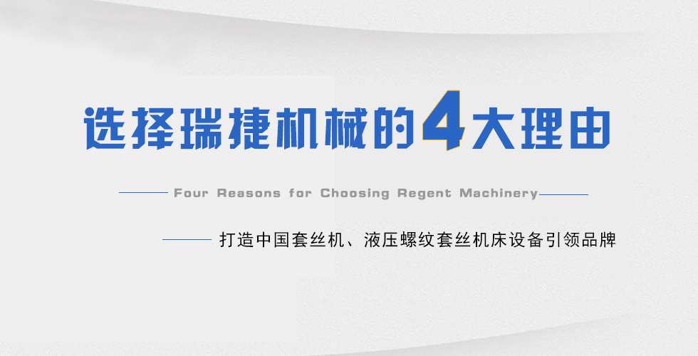 瑞捷套絲機設備采用液壓裝置成功解決勞動強度大,效率低,且無定位裝置,絲扣長短難控制等弊端,可一次型完成螺紋加工成型且螺紋牙形飽滿光滑。套絲機的主要部件及結構是由套絲機床的傳動系統,支架系統,切線板牙頭,定位裝置及液壓系統組成,工作時只要將工件裝入夾鉗,其余程序將自動完成,操作簡單,通俗易懂,瑞捷套絲機廠家直銷,質量有保證,減少不必要的中間環節,為客戶帶來實實在在的優惠政策,歡迎新老客戶洽談合作事宜和來電咨詢.